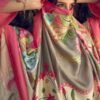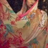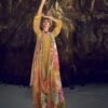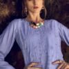 Complementing the stunning top is the bottom, crafted from pure gaji silk, which features a vibrant digital print that is both eye-catching and sophisticated. The addition of charming tassels further elevates the design, adding a playful yet elegant touch. This combination of muslin and gaji silk not only enhances the overall look but also provides versatility in styling, allowing wearers to create a range of outfits tailored to their individual preferences. The luxurious feel of gaji silk against the skin ensures comfort throughout the day, while the contemporary digital print resonates with fashion-forward individuals who appreciate modern aesthetics.