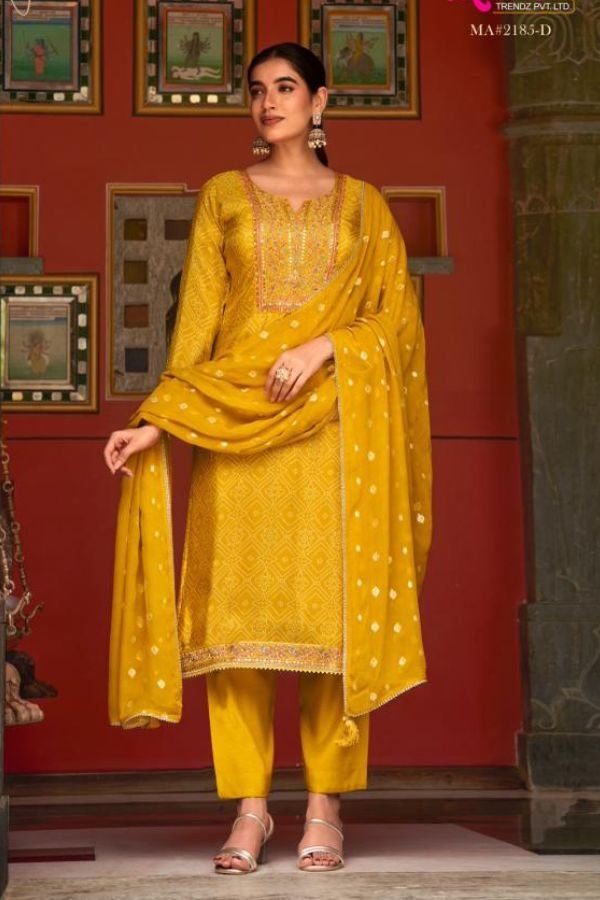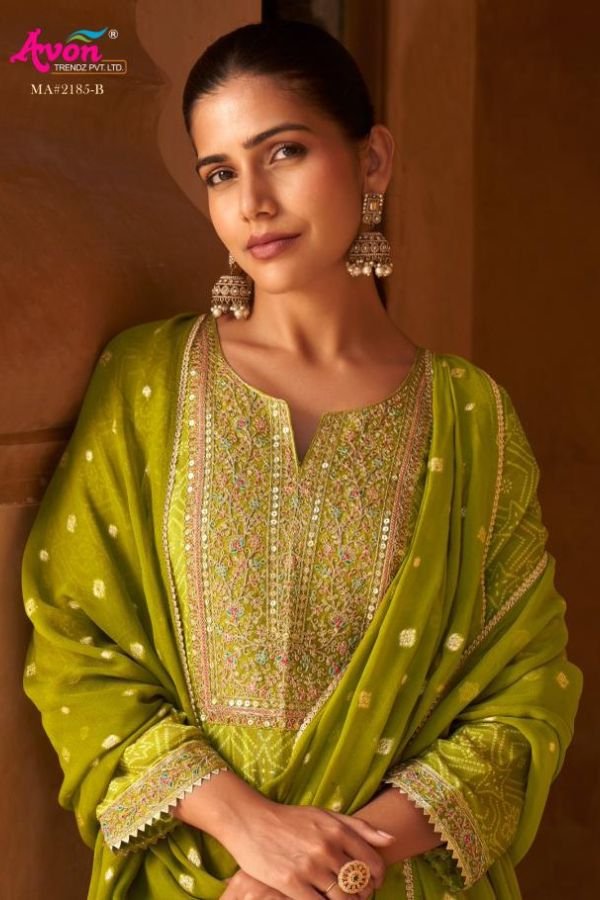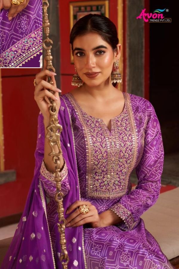 1. Discover the exquisite Avon Trendz Mayuri 5pcs Salwar Suit Catalog, a perfect blend of elegance and comfort designed for the modern woman. This collection is tailored to keep you warm and stylish throughout the summer season. Each set features a top crafted from kanjivaram tissue silk digital print , adorned with with exclusive coarding sequence embroidery that adds a touch of sophistication to your wardrobe. The intricate detailing not only enhances the aesthetic appeal but also ensures that you stand out on any occasion.