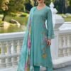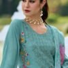 The top of this suit set is made from pure Bemberg muslin fabric, which is known for its softness and luxurious feel. The intricate embroidery work on the top adds a touch of glamour and makes it perfect for special occasions or festive events. The bottom is made from pure rayon fabric, which is lightweight and comfortable to wear. It complements the top perfectly and creates a balanced and cohesive look.