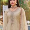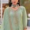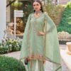 2. The top of the suit is crafted from Simar Organza fabric, which is known for its lightweight and sheer texture. It is adorned with exquisite embroidery work, adding a touch of glamour to the overall look. The bottom and dupatta also feature the same Simar Organza fabric with matching embroidery work, creating a cohesive and sophisticated ensemble.