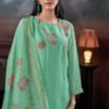 2. The bottom of this elegant ensemble is crafted from premium pure viscose silk solid color, providing a perfect balance of style and comfort. The choice of solid color allows for versatility, making it easy to pair with various accessories and footwear for different occasions. The dupatta, made from premium pure silk satin printed with crochet lace border, adding a touch of grace and sophistication to the overall look. This combination of high-quality fabrics and thoughtful design elements makes the Ganga Fashion Greesha S3828 an ideal choice for women who wish to make a statement.