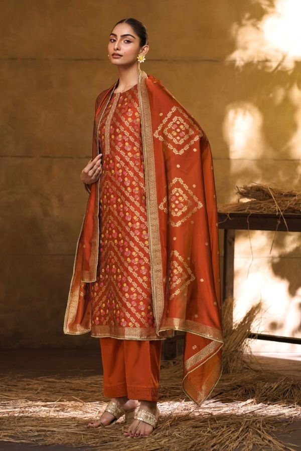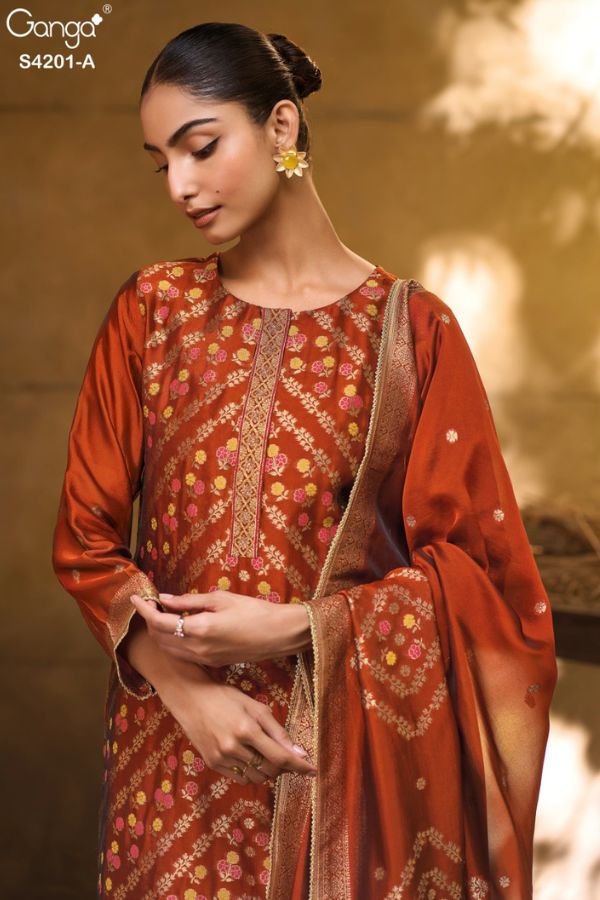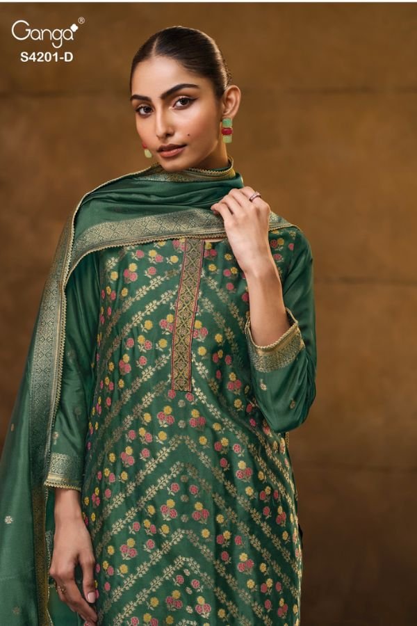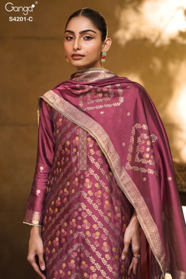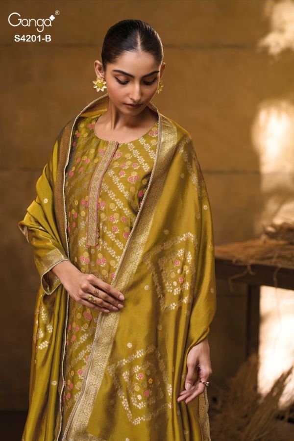 1. Introducing the Ganga Fashion Jerica S4201 Silk Unstitched Ladies Catalog, a stunning collection designed for the modern woman who appreciates elegance and sophistication. This exquisite four-piece set is perfect for reselling, offering a unique blend of premium materials and intricate craftsmanship. The catalog features a top made from luxurious Premium pure viscose woven silk jacquard with embroidery, swarovski work, jari lace on daman and sleeves detailing. This attention to detail ensures that each piece not only looks beautiful but also feels comfortable against the skin.