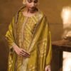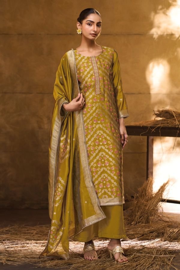 2. The bottom of this elegant ensemble is crafted from premium silk satin solid color, providing a perfect balance of style and comfort. The choice of solid color allows for versatility, making it easy to pair with various accessories and footwear for different occasions. The dupatta, made from premium pure viscose woven silk jacquard with jari lace border, adding a touch of grace and sophistication to the overall look. This combination of high-quality fabrics and thoughtful design elements makes the Jerica S4201 an ideal choice for women who wish to make a statement.
