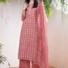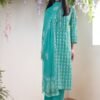 2. Complementing the stunning top is a solid-colored bottom made from premium cotton solid color, providing a perfect balance of comfort and versatility. The simplicity of the bottom allows for easy pairing with various accessories and footwear, making it an ideal choice for both casual outings and formal events. The set is completed with a luxurious dupatta made from premium pure chiffon, featuring a captivating print . This dupatta not only enhances the overall aesthetic of the outfit but also adds an element of grace and fluidity to your look.