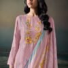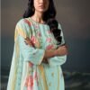 2. Complementing the stunning top is a solid-colored bottom made from premium silk satin, providing a perfect balance of comfort and versatility. The simplicity of the bottom allows for easy pairing with various accessories and footwear, making it an ideal choice for both casual outings and formal events. The set is completed with a luxurious dupatta made from premium pure bemberg lawn featuring a captivating print and finished with crochet lace border. This dupatta not only enhances the overall aesthetic of the outfit but also adds an element of grace and fluidity to your look.