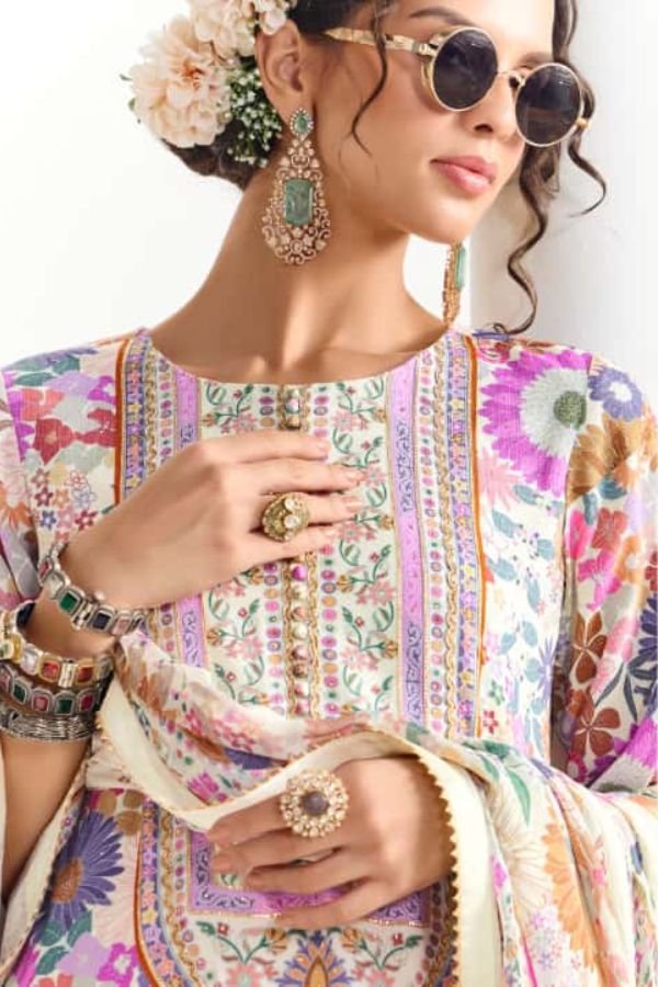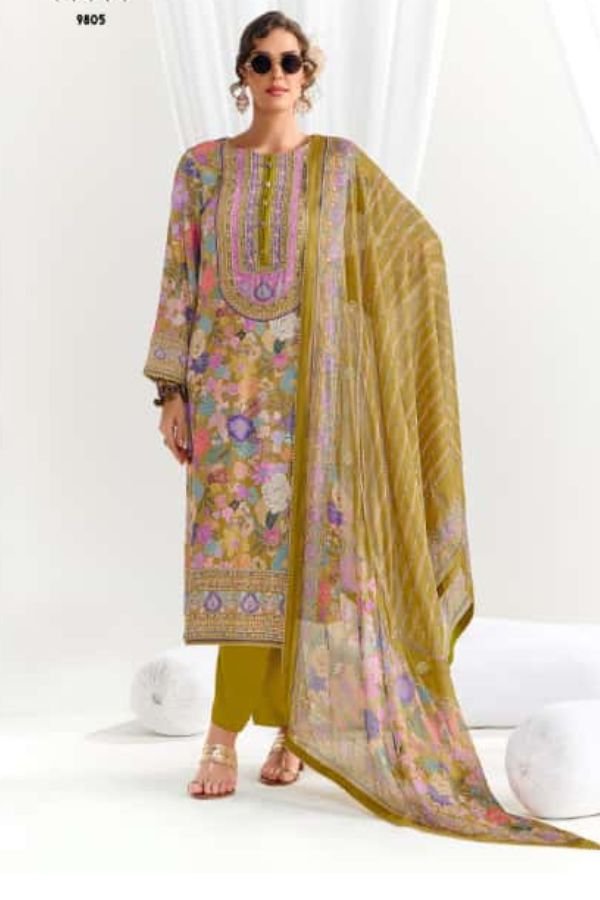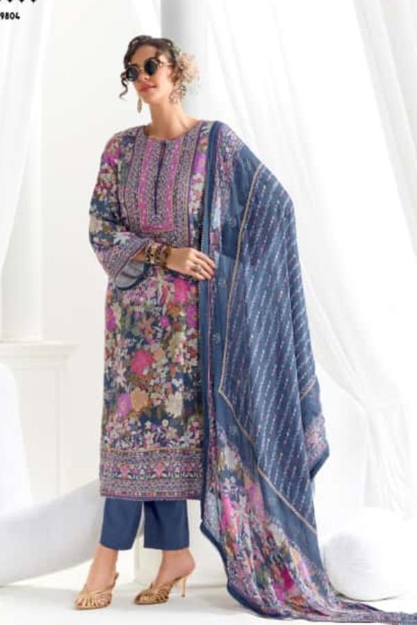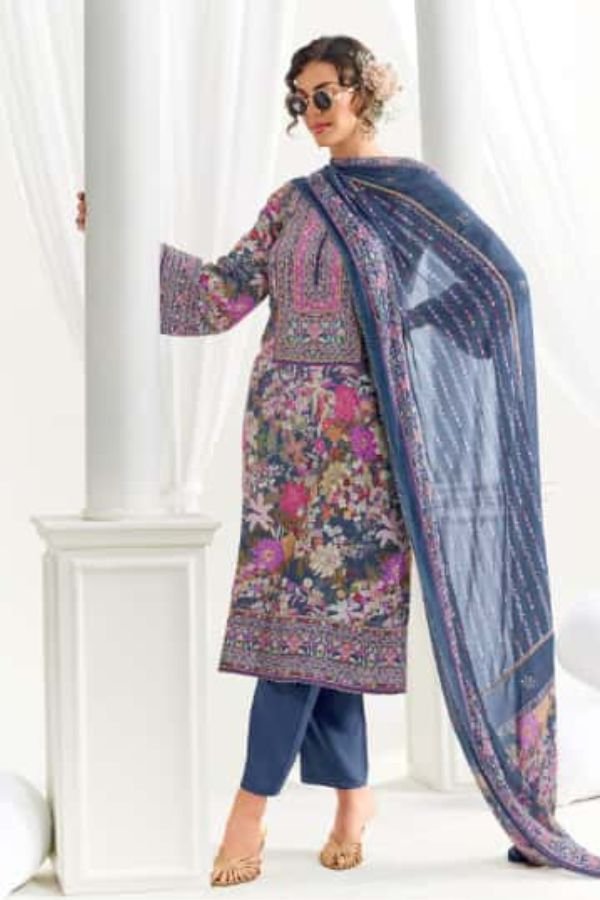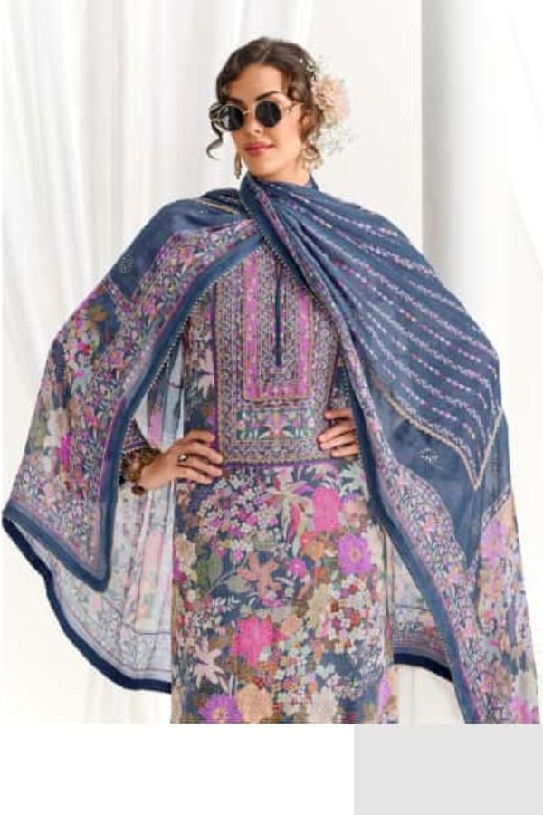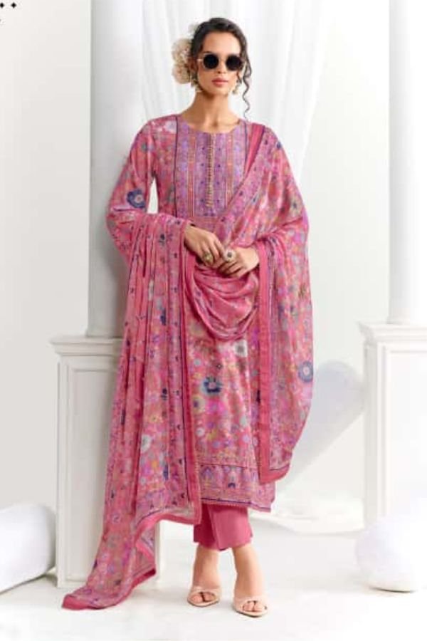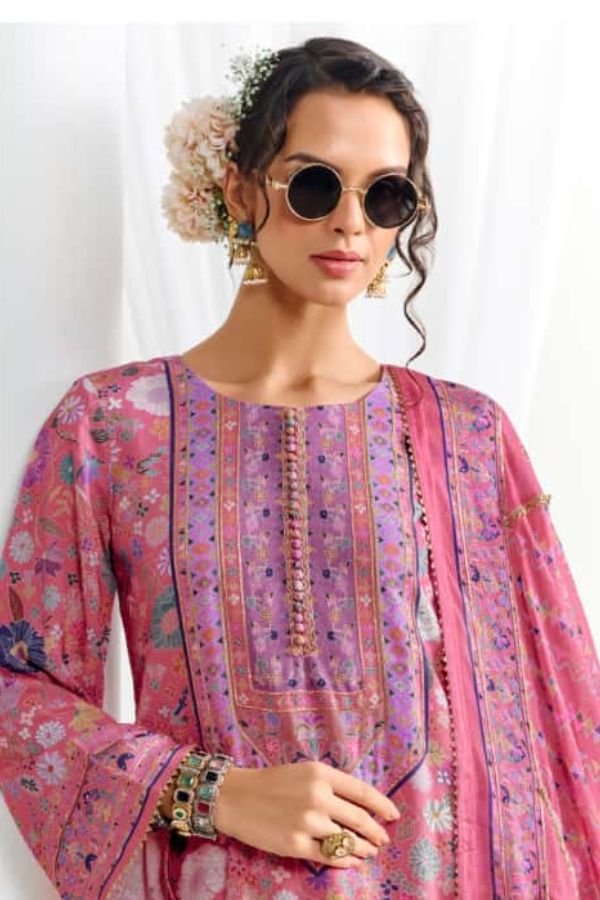 1. Introducing the exquisite Heer Chamak catalog by Kimora Fashion, a collection that epitomizes elegance and sophistication in traditional attire. This full catalog features six stunning unstitched suits, each crafted from pure pashmina digital printed fabric, renowned for its lightweight and breathable qualities. The tops are adorned with intricate with kinari gotta stitching details, mukaish highlighting and gotta kinari lace hemline and sleeves, ensuring that each piece stands out with a unique charm. The scalloped dori embroidery hemline adds a touch of finesse, making these suits perfect for festive occasions or formal gatherings.