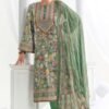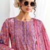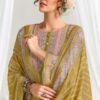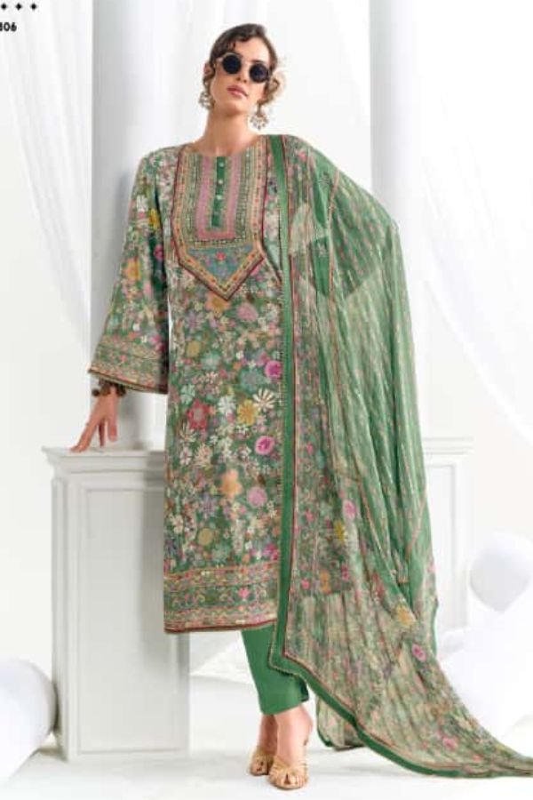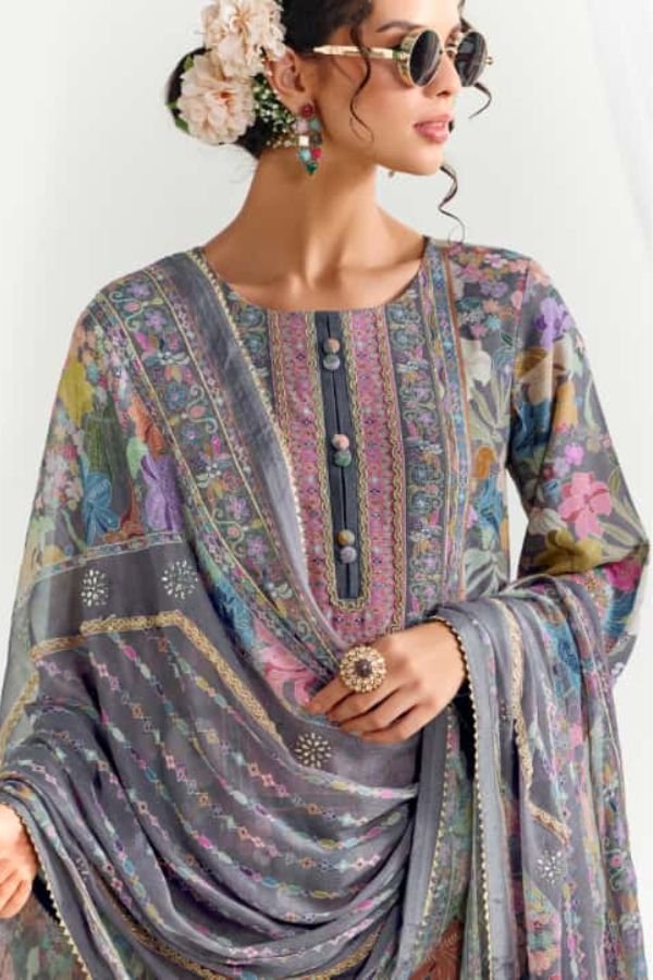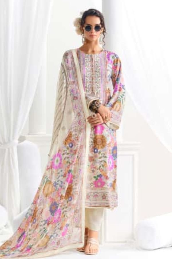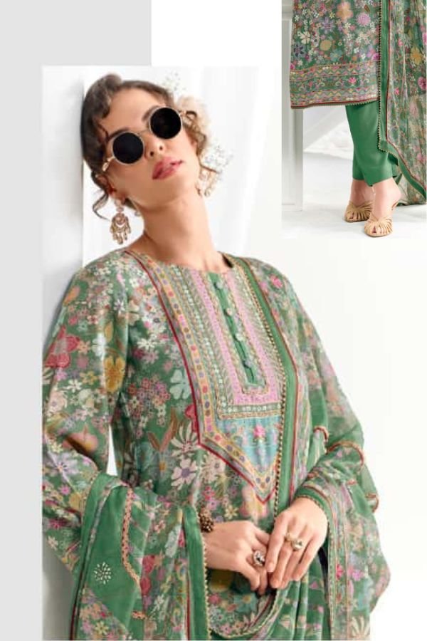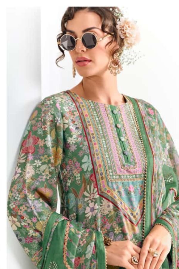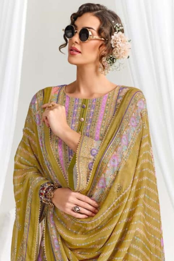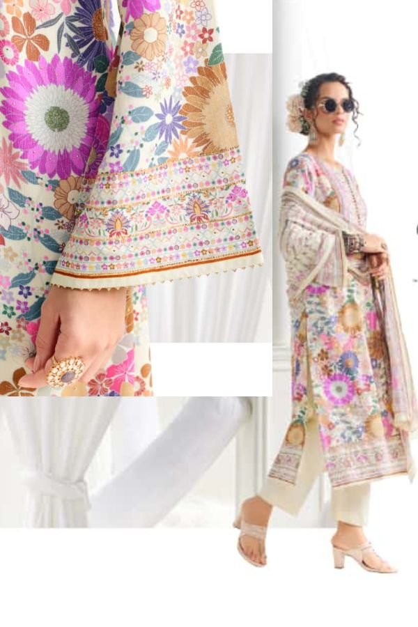 1. Introducing the exquisite Heer Chamak catalog by Kimora Fashion, a collection that epitomizes elegance and sophistication in traditional attire. This full catalog features six stunning unstitched suits, each crafted from pure pashmina digital printed fabric, renowned for its lightweight and breathable qualities. The tops are adorned with intricate with kinari gotta stitching details, mukaish highlighting and gotta kinari lace hemline and sleeves, ensuring that each piece stands out with a unique charm. The scalloped dori embroidery hemline adds a touch of finesse, making these suits perfect for festive occasions or formal gatherings.