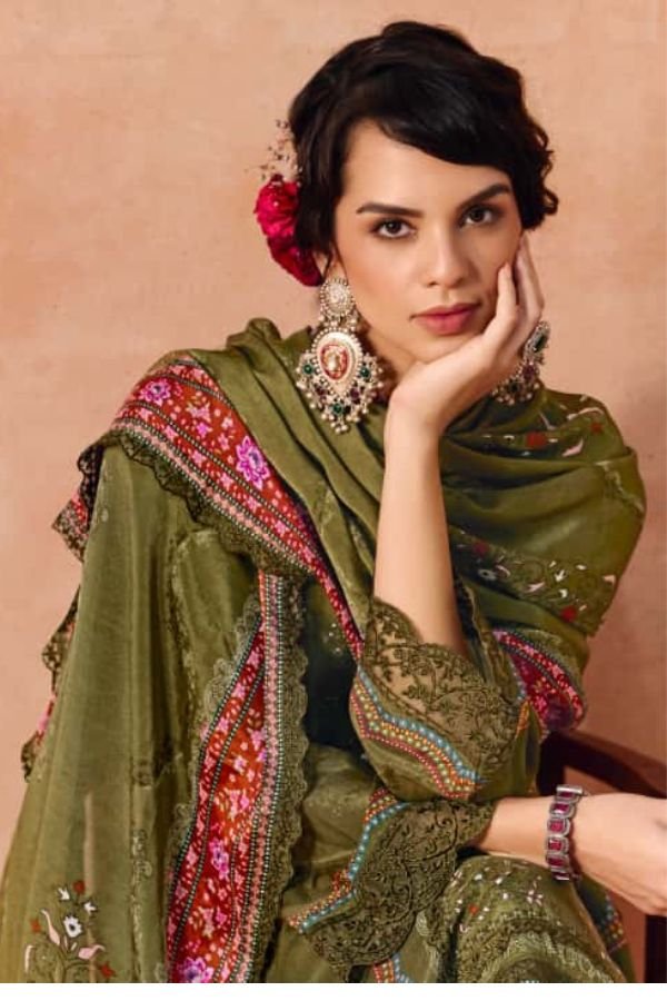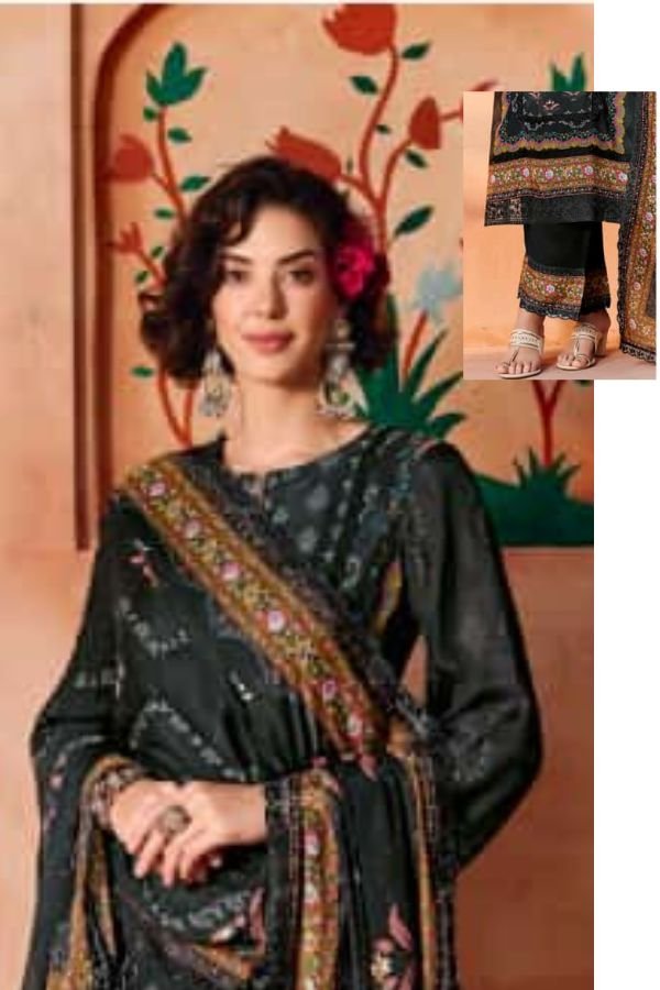 1. Introducing the exquisite Heer Ishqia catalog by Kimora Fashion, a collection that epitomizes elegance and sophistication in traditional attire. This full catalog features six stunning unstitched suits, each crafted from pure pashmina digital printed fabric, renowned for its lightweight and breathable qualities. The tops are adorned with intricate with scalloped resham embroidery border hemline and sleeves, ensuring that each piece stands out with a unique charm. The panel and hand crafted embroidery patch on neckline adds a touch of finesse, making these suits perfect for festive occasions or formal gatherings.