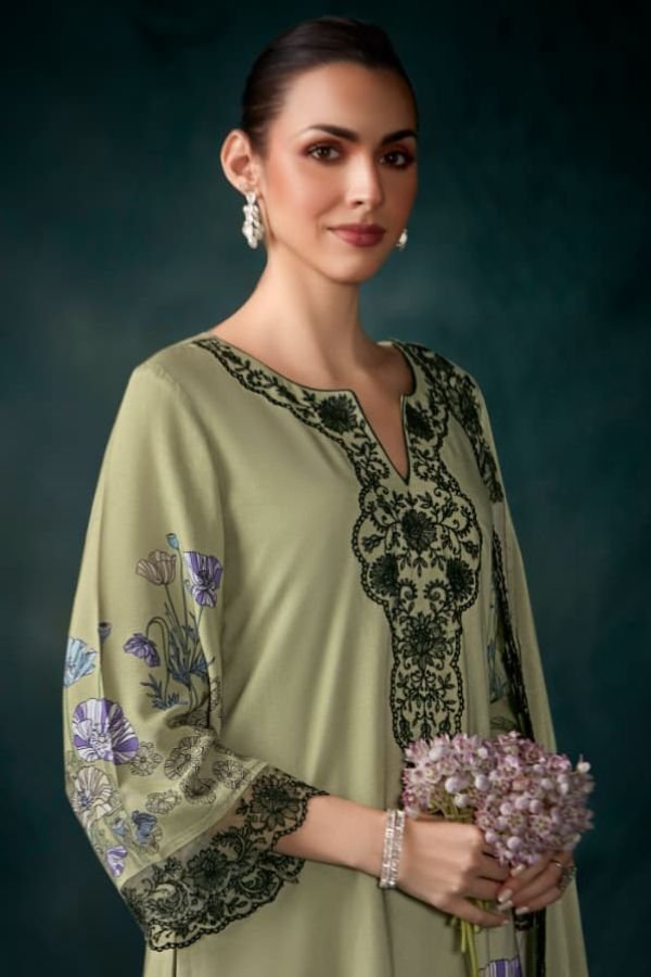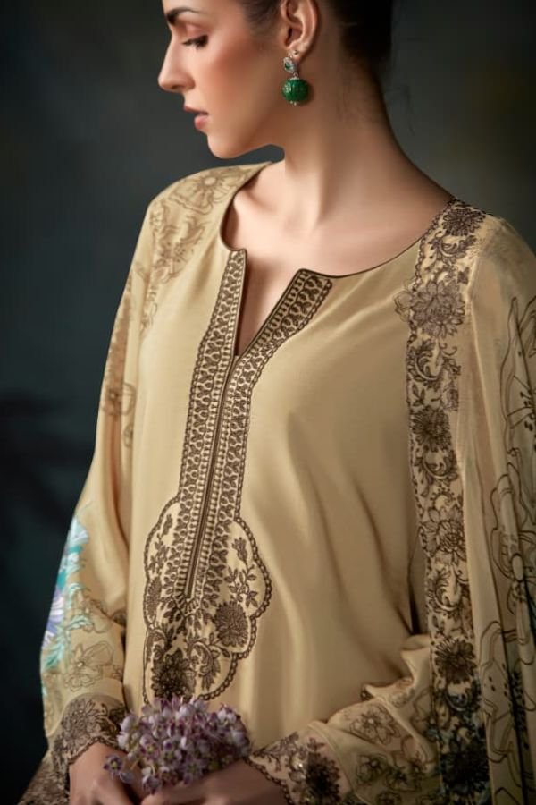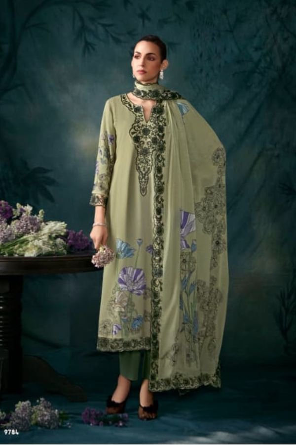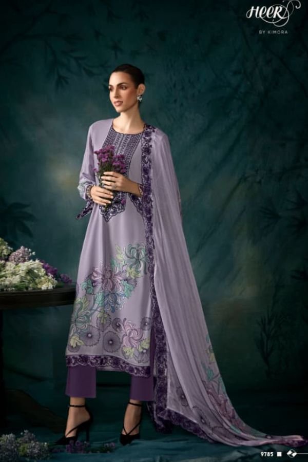 1. Introducing the exquisite Heer Paradise catalog by Kimora Fashion, a collection that epitomizes elegance and sophistication in traditional attire. This full catalog features six stunning unstitched suits, each crafted from pure muslin digital printed fabric, renowned for its lightweight and breathable qualities. The tops are adorned with resham embroidery neckline, scalloped resham embroidery border hemline and sleeves, ensuring that each piece stands out with a unique charm. The digital print adds a touch of finesse, making these suits perfect for festive occasions or formal gather in paisley, scalloped , appliqued organza patch on hemline.
