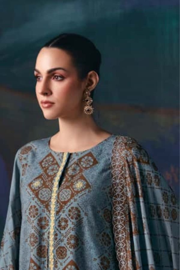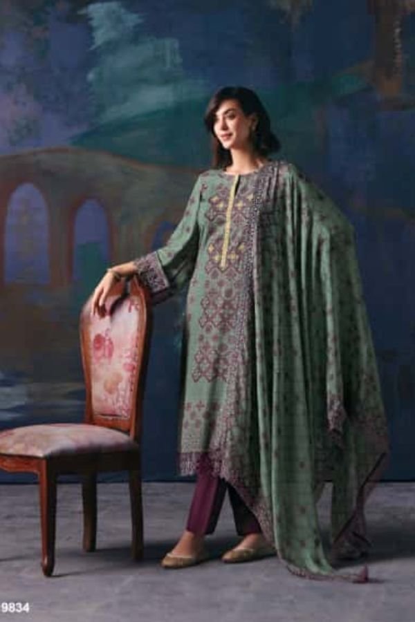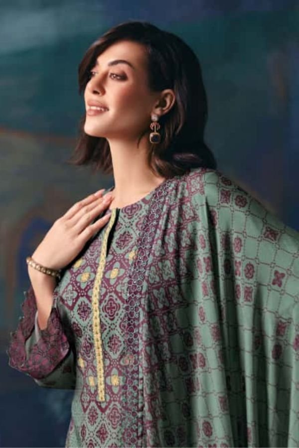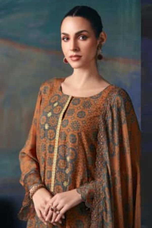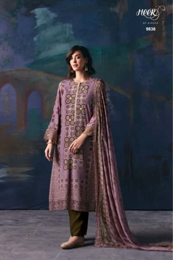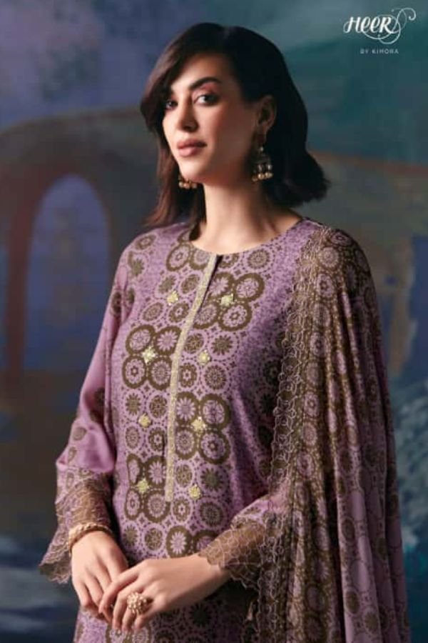 1. Introducing the exquisite Heer Romance catalog by Kimora Fashion, a collection that epitomizes elegance and sophistication in traditional attire. This full catalog features six stunning unstitched suits, each crafted from pure muslin fabric, renowned for its lightweight and breathable qualities. The tops are adorned with dori placket, patch buttis neck, resham scalloped embroidery border hemline and sleeves, ensuring that each piece stands out with a unique charm. The digital print adds a touch of finesse, making these suits perfect for festive occasions or formal gatherings.