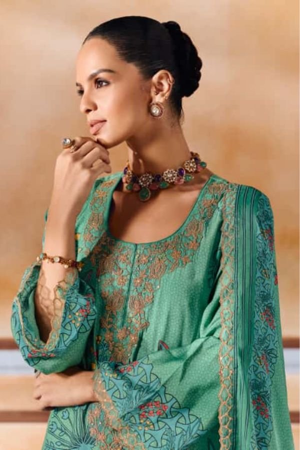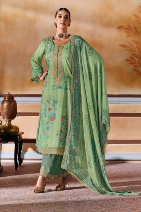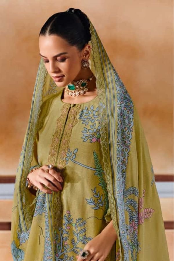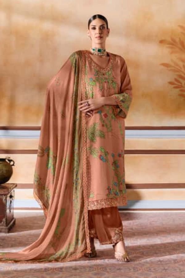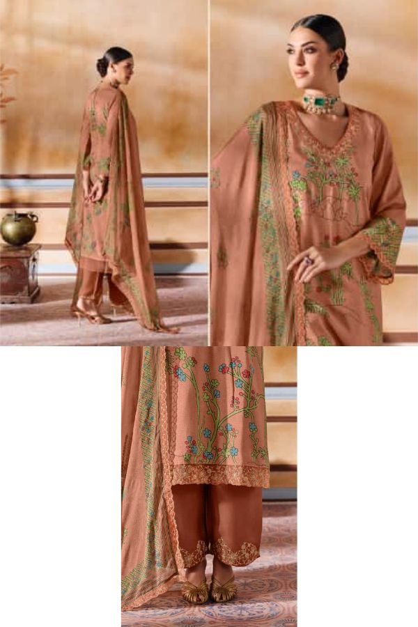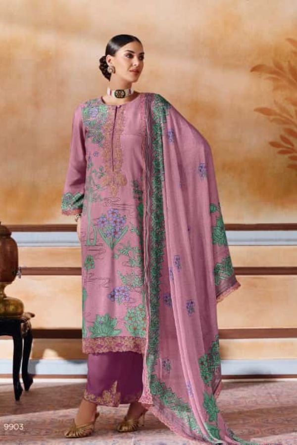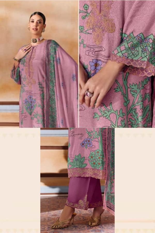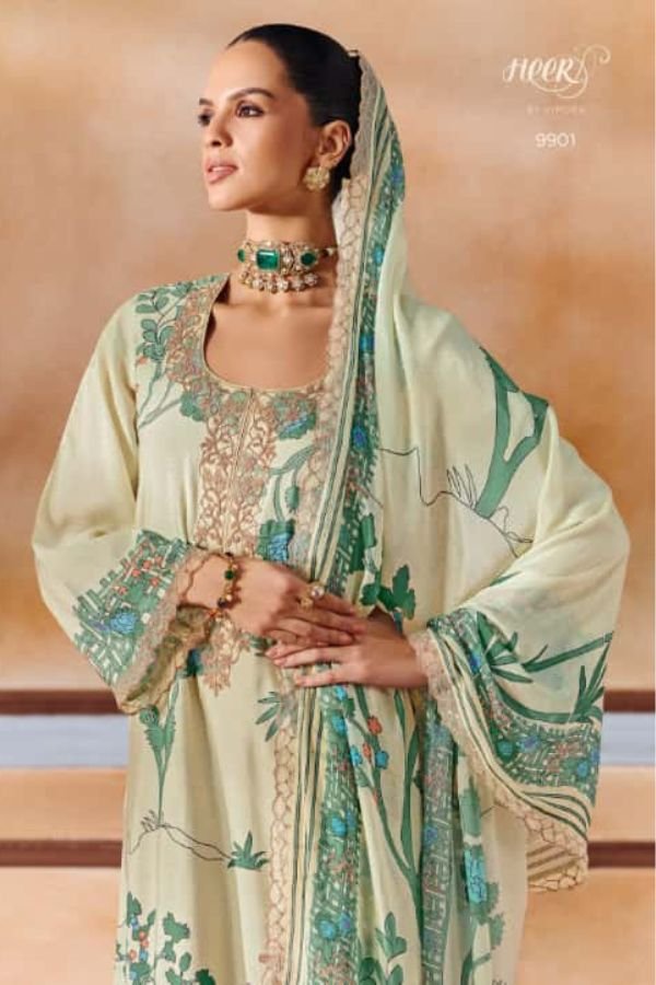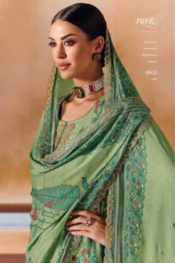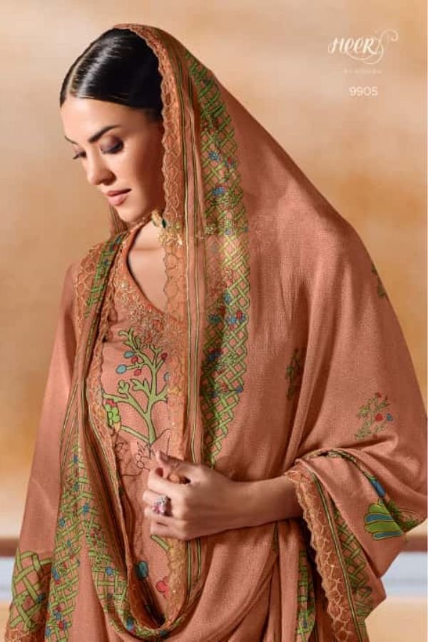1. Introducing the exquisite Heer Shayri catalog by Kimora Fashion, a collection that epitomizes elegance and sophistication in traditional attire. This full catalog features six stunning unstitched suits, each crafted from pure pashmina digital printed fabric, renowned for its lightweight and breathable qualities. The tops are adorned with intricate pitta applique neckline, scalloped pitta embroidery, hemline and sleeves, , ensuring that each piece stands out with a unique charm. The scalloped dori embroidery hemline adds a touch of finesse, making these suits perfect for festive occasions or formal gatherings.