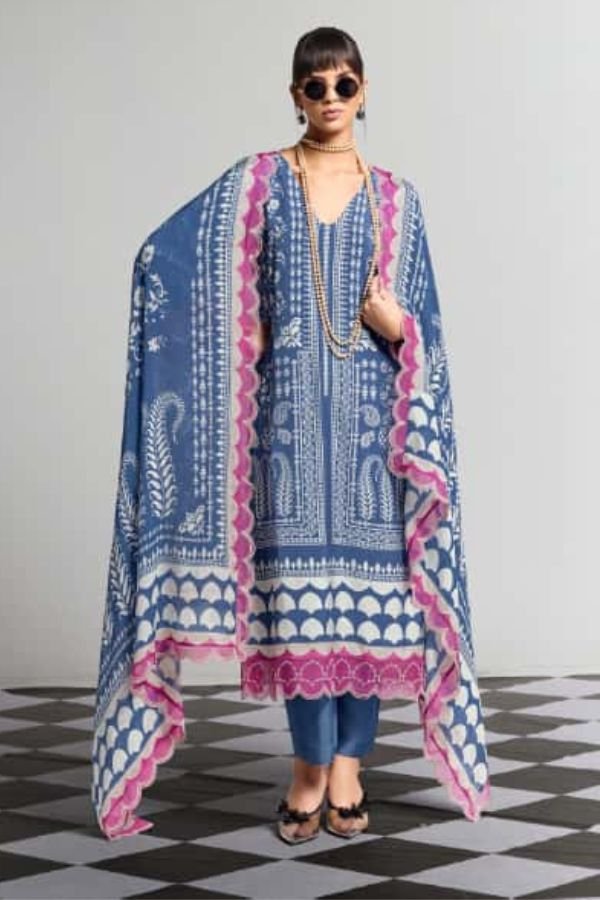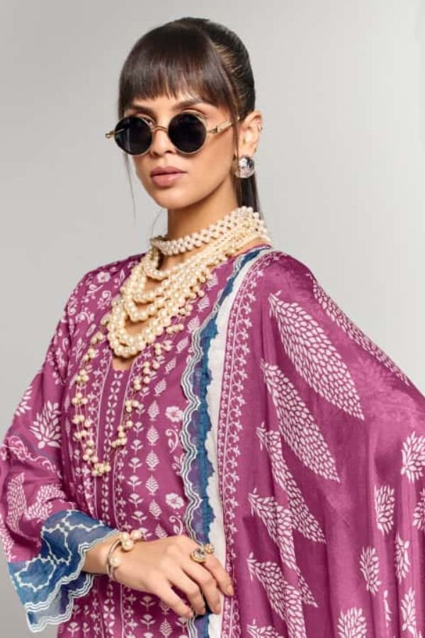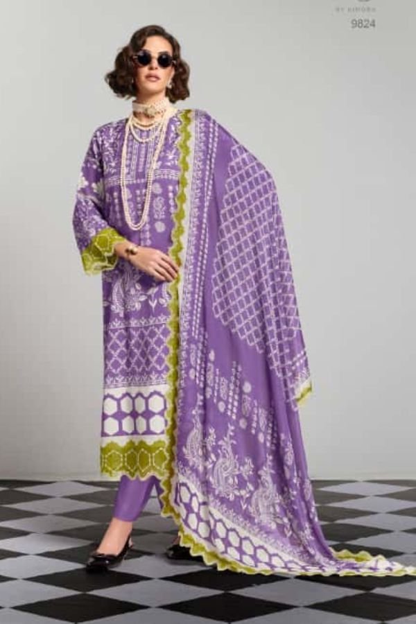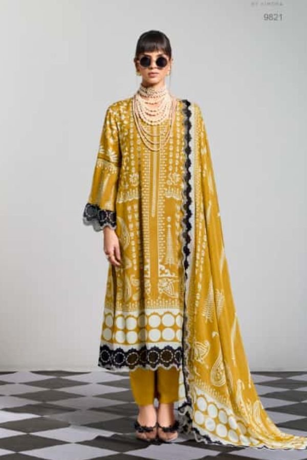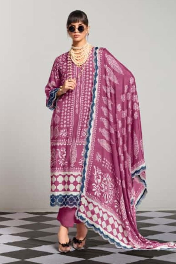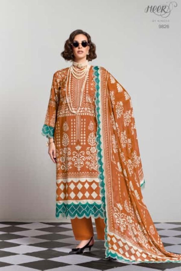 1. Introducing the exquisite Heer Wow catalog by Kimora Fashion, a collection that epitomizes elegance and sophistication in traditional attire. This full catalog features six stunning unstitched suits, each crafted from pure pashmina digital printed fabric, renowned for its lightweight and breathable qualities. The tops are adorned with intricate with scalloped resham embroidery border  hemline and sleeves, , ensuring that each piece stands out with a unique charm. The scalloped dori embroidery hemline adds a touch of finesse, making these suits perfect for festive occasions or formal gatherings.