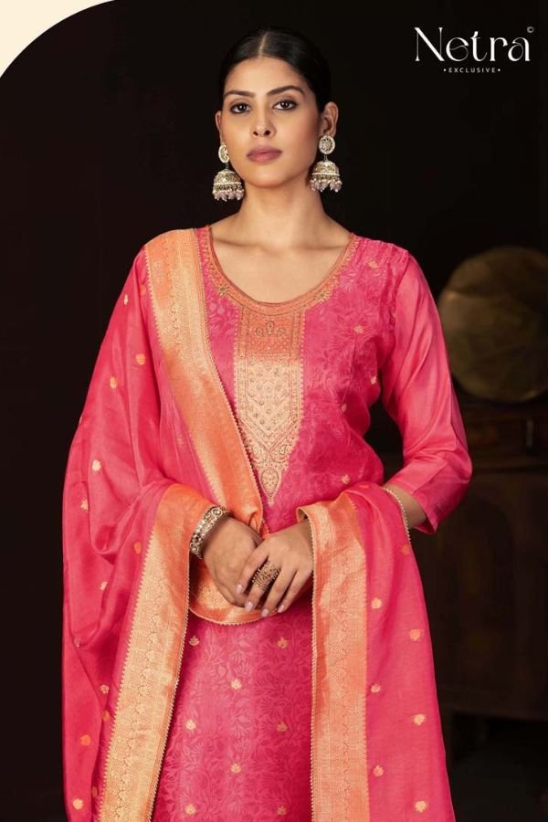 Discover the elegance of the Netra Exclusive Jitika Ladies 6Pcs Unstitched Suit Catalog, a collection designed to elevate your wardrobe for any occasion. This exquisite ensemble features a top crafted from pure lakhnavi weaving silk, adorned with double jacquard with additional swarovski work that adds a touch of sophistication and artistry. The rich texture and stunning design make it a perfect choice for festive celebrations, formal gatherings, or casual outings, ensuring you always look your best.