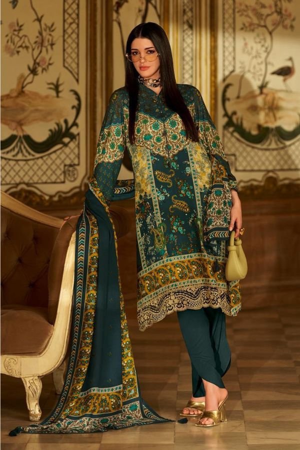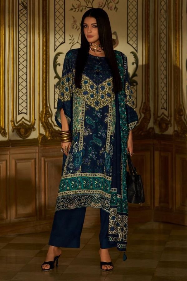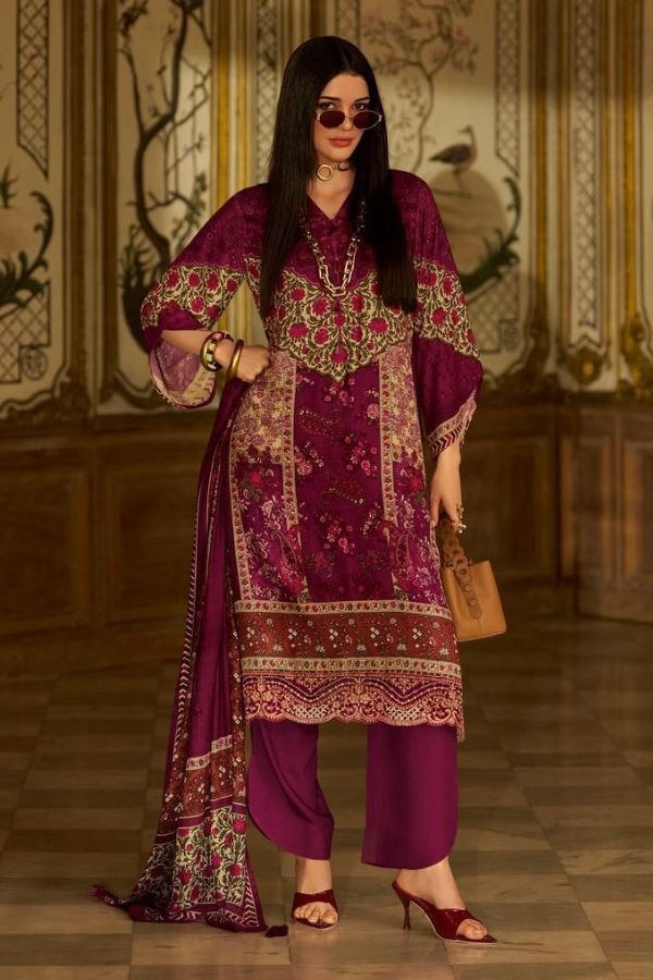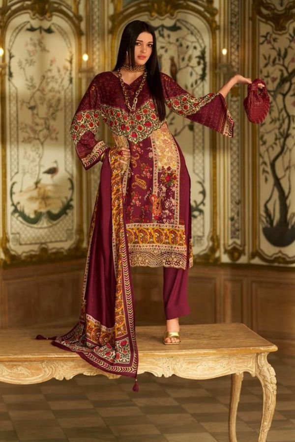 The top of this suit features a stunning Viscose pashmina print, adorned with intricate embroidery . It is a perfect blend of traditional and contemporary designs, making it a versatile choice for any occasion.