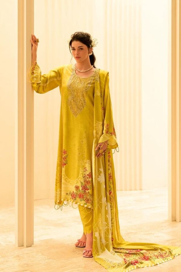 This exquisite suit set is brought to you by the renowned brand, Varsha Fashion, ensuring top-notch quality and style. From their coveted Two of A Kind Vol 3 Pashmina catalogue, this set is a true masterpiece.
