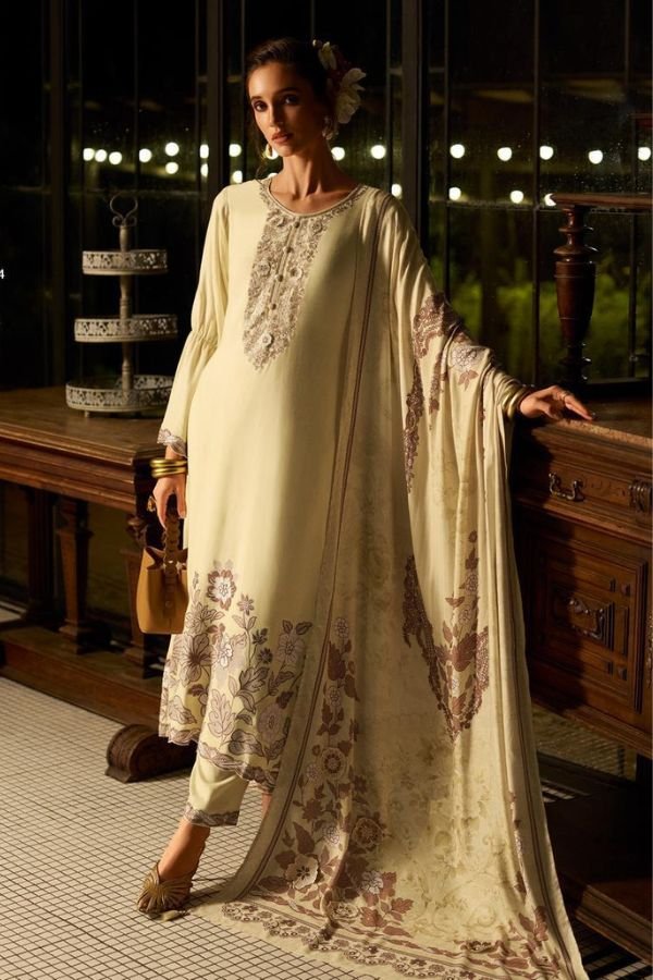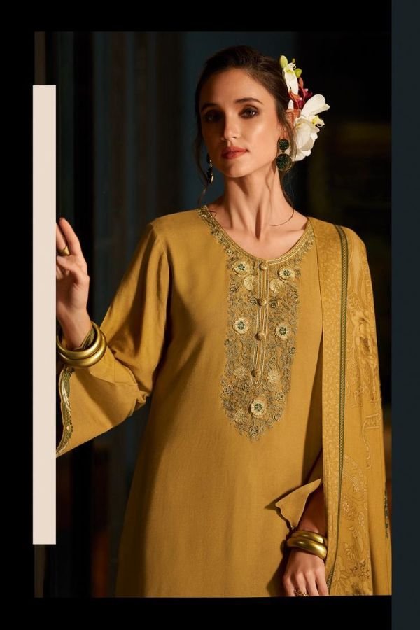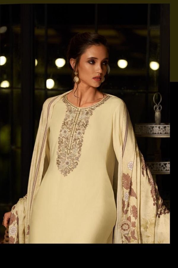The top of this suit features a stunning Viscose pashmina woven , adorned with intricate embroidery. It is a perfect blend of traditional and contemporary designs, making it a versatile choice for any occasion.