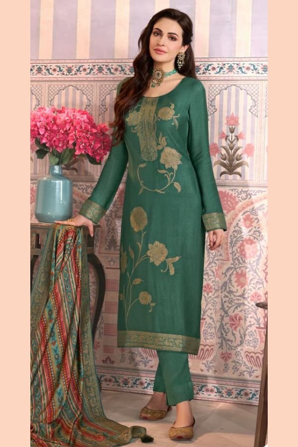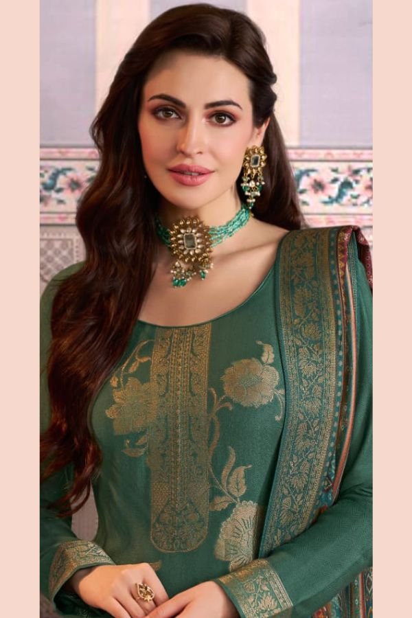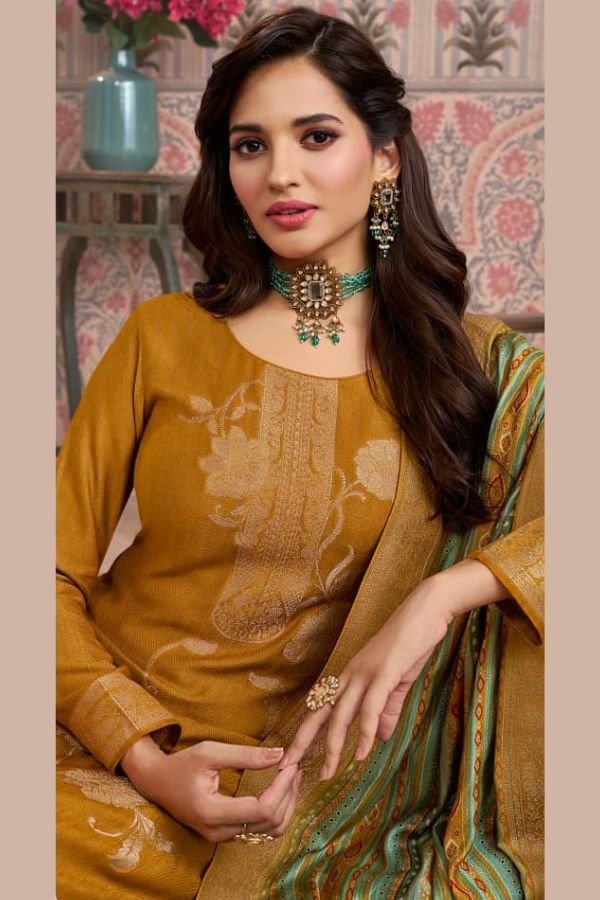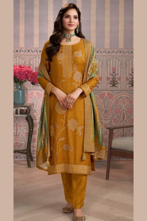 The top of this suit set is made from high-quality viscose pashmina jacquard fabric, ensuring a luxurious feel and a stunning drape. The intricate jacquard pattern adds a touch of sophistication to the overall look.