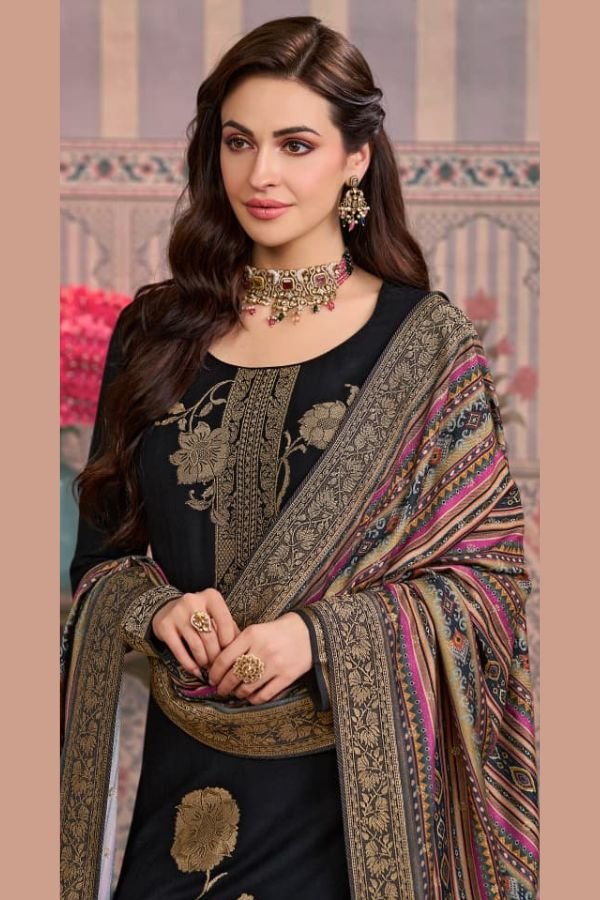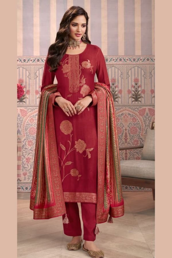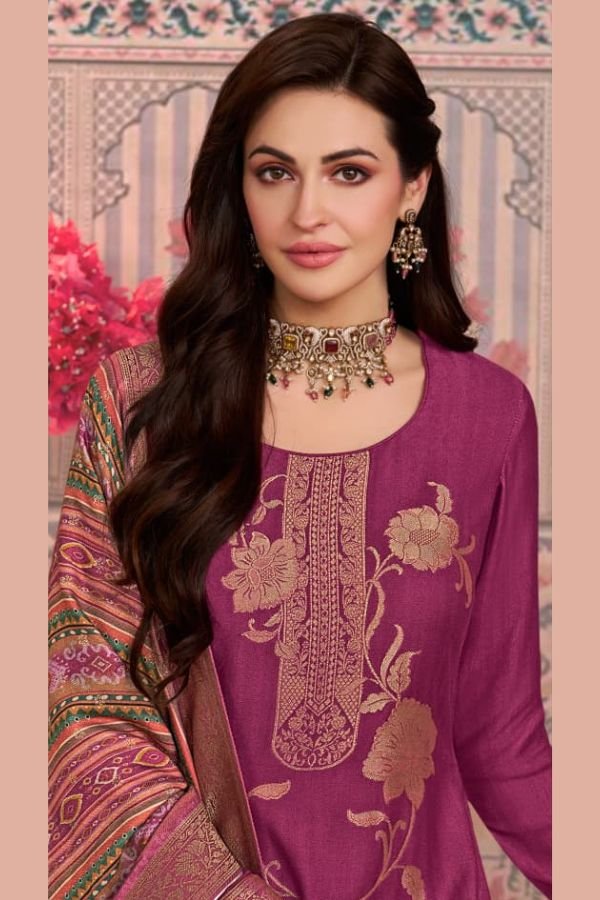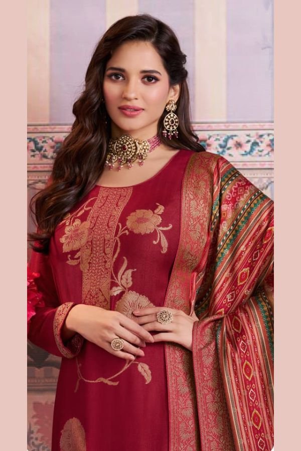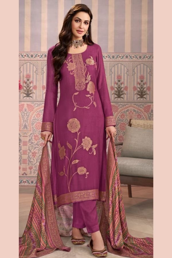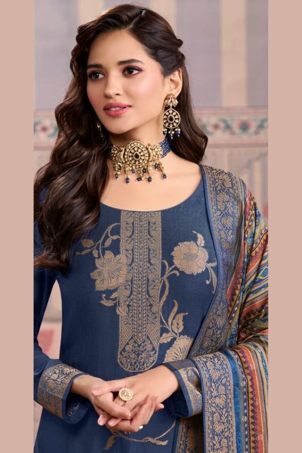 To complete the look, the suit set comes with a beautiful dupatta featuring a digital print on viscose pashmina jacquard fabric. The vibrant colors and intricate design of the dupatta add a touch of glamour and elegance to the overall ensemble.